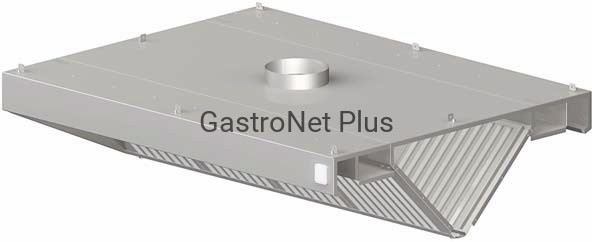 Okap centralny skośny 1000x1600x450 mm wykonany z wysokiej jakości stali nierdzewnej. Rynienka ociekowa z zaworem spustowym. Przy szerokości powyżej 2900 mm okap dzielony na segmenty. Przy składaniu zamówienia należy podać średnicę, ilość oraz rozmieszczenie króćców przyłączeniowych. Dostępne króćce przeznaczone do montażu rur o średnicy: 100, 150, 160, 200, 250, 300, 315 mm. Labiryntowe łapacze tłuszczu oraz oświetlenie halogenowe dopłata. Zasilanie 230 V. Okap sprzedawany bez zawiesi.