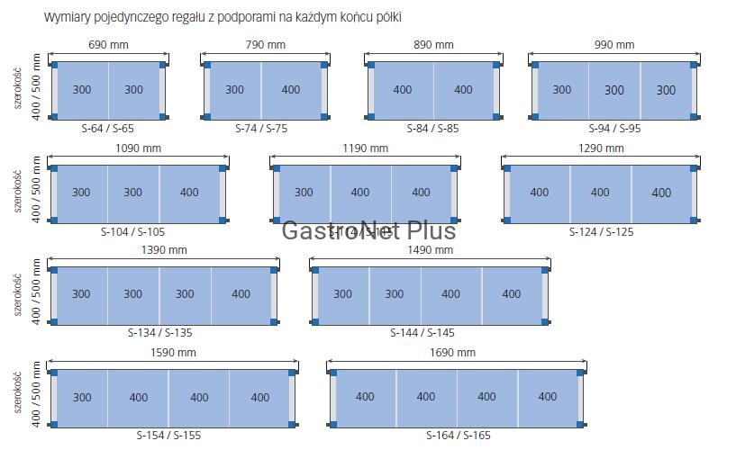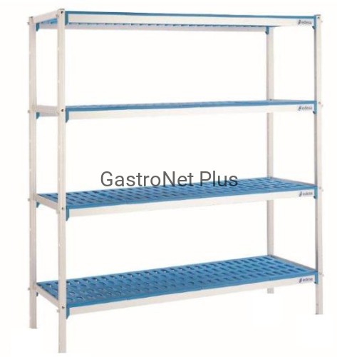 Regał z anodyzowanego aluminium z półkami przeznaczonymi do kontaktu z żywnością. Przystosowany do różnorodnego zastosowania, zwłaszcza w pomieszczeniach o wysokich wymogach sanitarnych – idealny do komór chłodniczych i mroźniczych. Łatwy montaż. Podpory regałów posiadają otwory co 270 mm, co pozwala na modyfikowanie standardowych zestawów i zwiększanie ilości półek w bardzo prosty sposób. Regulowana wysokość nóżek pozwala na dostosowanie do nierówności podłoża. Regał posiada 5 półki o szerokości 400 mm.