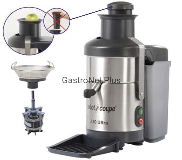 sokowirówka w otworem wylotowym przeznaczona do przygotowania świeżych soków owocowych i warzywnych opatentowany system automatycznego otworu wsadowego umożliwiający ciągłe podawanie owoców i warzyw o średnicy do 79 mm obudowa silnika ze stali nierdzewnej